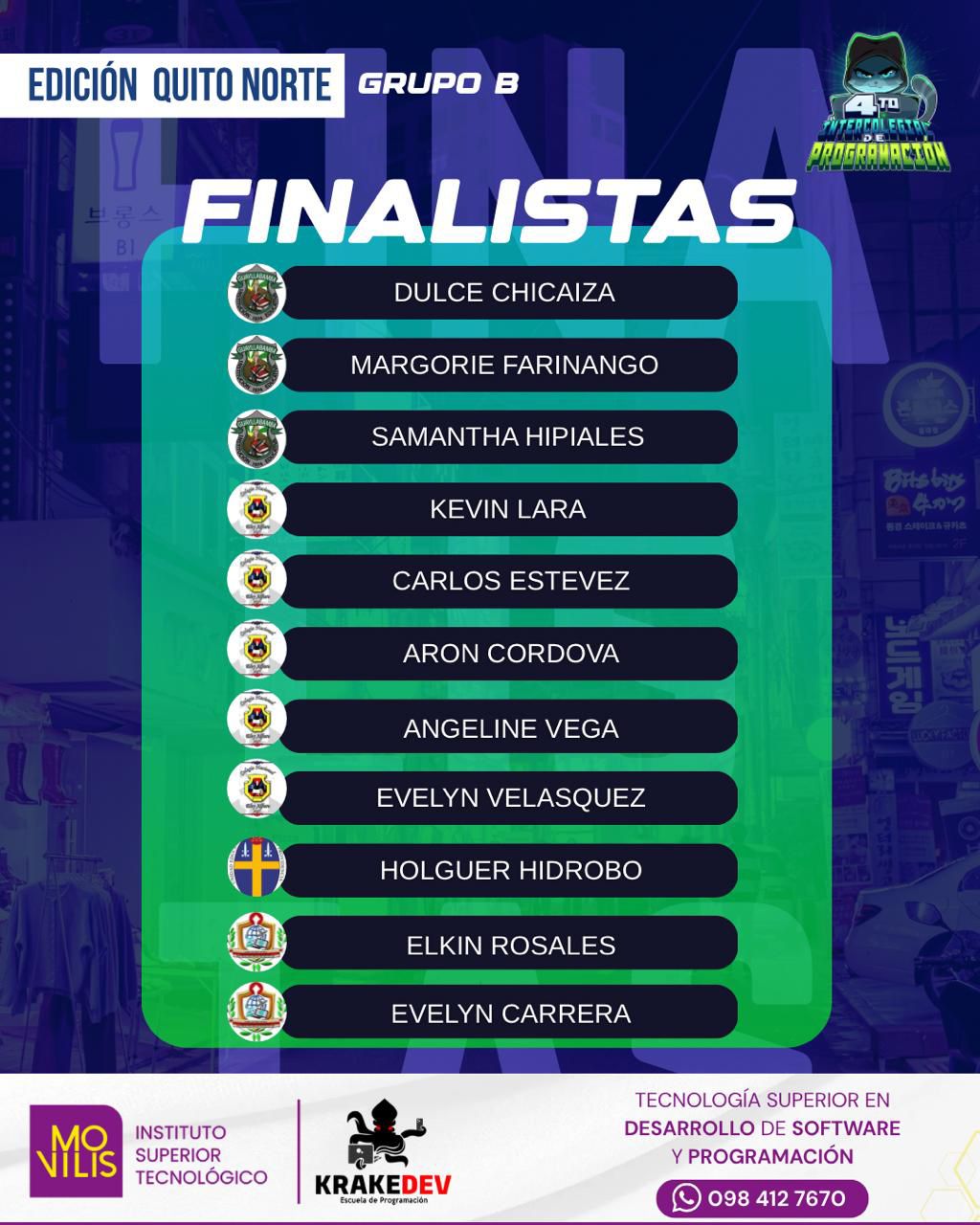 "Queremos felicitar a los estudiantes y a la Unidad Educativa Patrimonio de la Humanidad 🏫 por haber alcanzado un importante logro al clasificar a la Gran Final Edición Quito Norte Grupo B 🏆 de esta cuarta edición del intercolegial. Este resultado refleja el esfuerzo, dedicación y compromiso tanto de los estudiantes como de su institución educativa en el desarrollo de habilidades en programación y pensamiento lógico 💡."